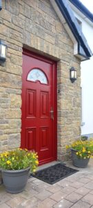 Sunbeam 1 style composite front door from The Palladio Door Collection. Red on the outside and White on the inside. TG40 stippolyte backing Glass. Dressed with a bright chrome lever/lever handle. The red door colour looks beautiful against the yellow pale tones in the surrounding brickwork.