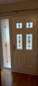 Georgian 2 style from The Palladio Door Collection. White on both sides. Dressed beautifully with fabulous accessories including The Doctor’s Knocker and a Door Knob. All the furniture including the Lever/lever Handle is in Bright Chrome. TG10 decorative Glass looks so well against the simplicity of the White. The White colour also looks lovely against the red tones in the brickwork.